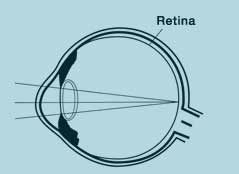In farsightedness, the eye is usually too short, so the light rays are focused behind the retina.