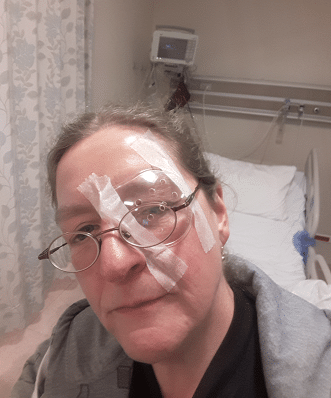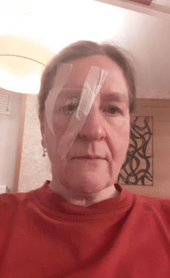 (Rechtes Auge, OP vom 22.02.2018; Spital-Outfit und Breakfast. Das linke Augs sieht top!)
